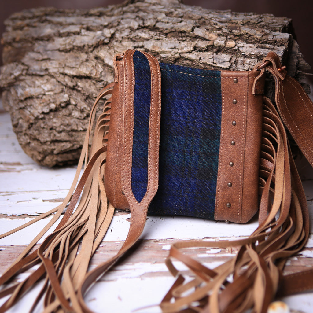 Small crossbody bag with Harris Tweed inlay in tartan pattern Black Watch. Brown pebbled leather. Matching phone pocket on back (fits an iPhone pro max!). 16 inch fringe.