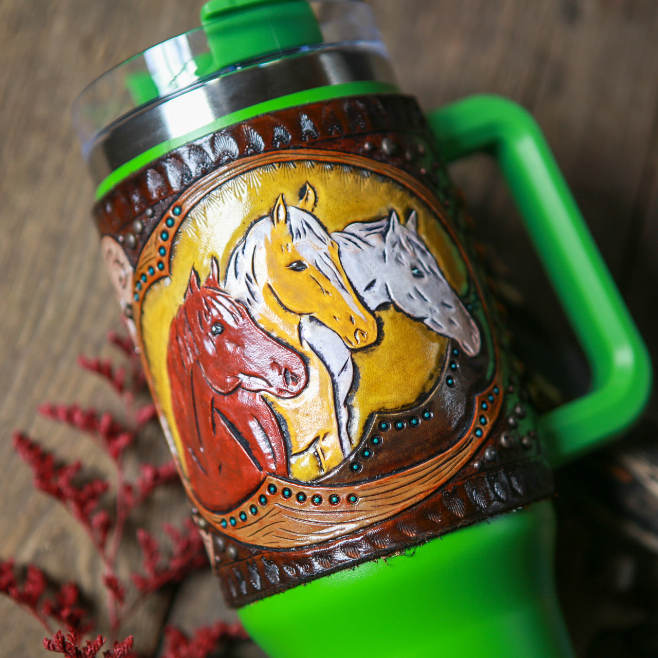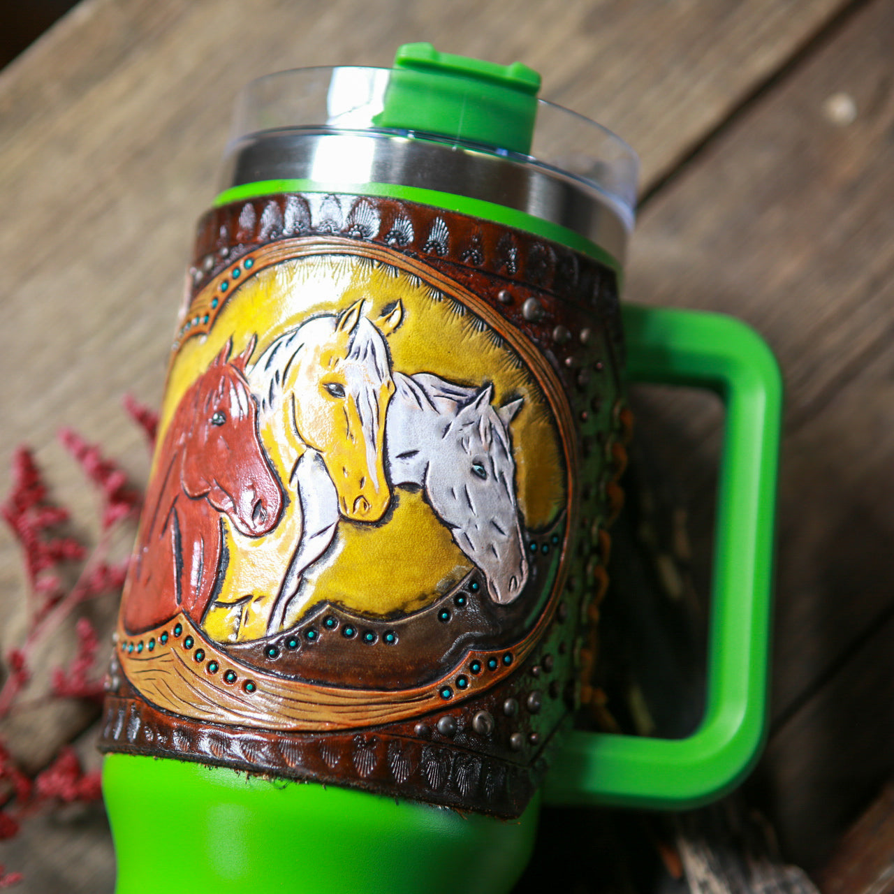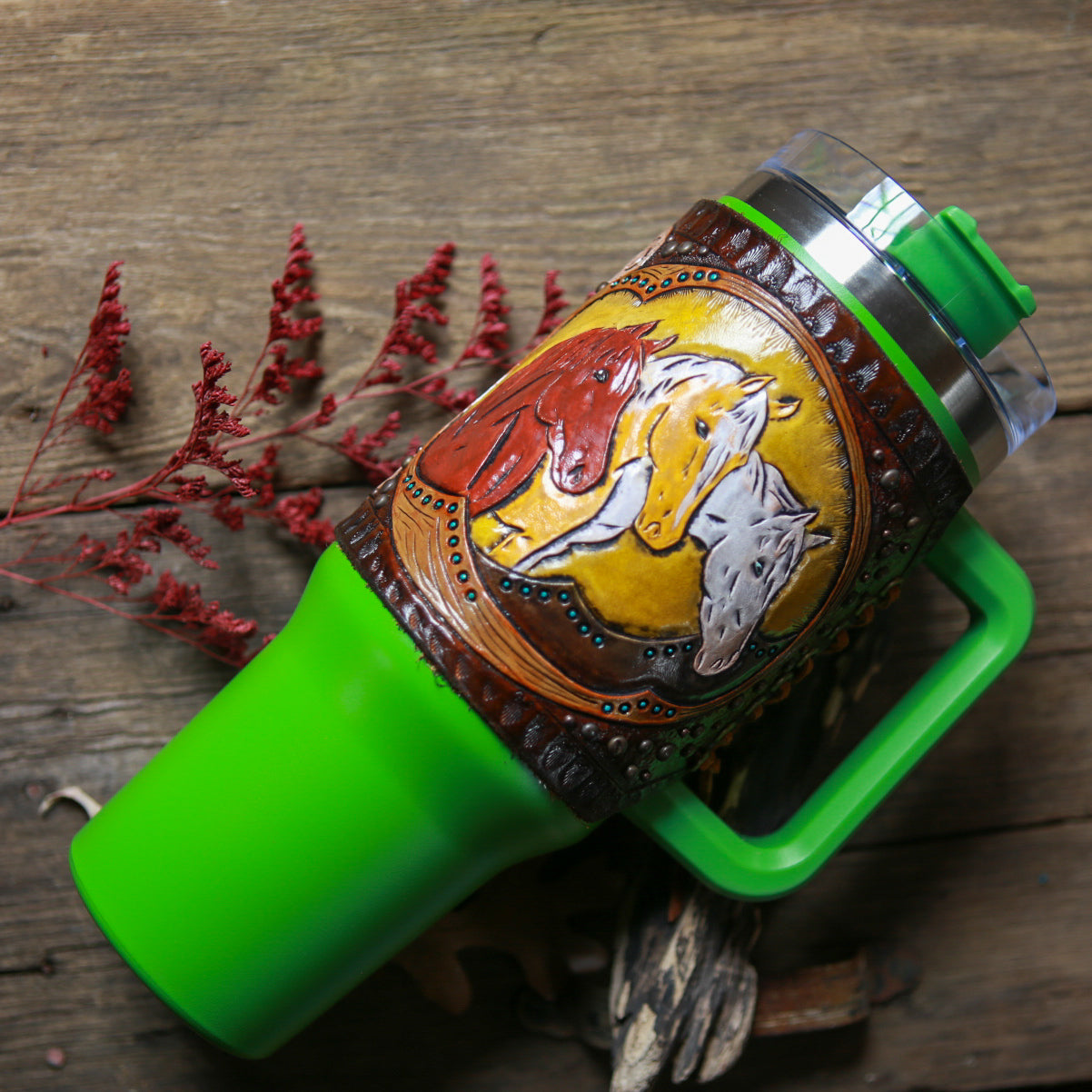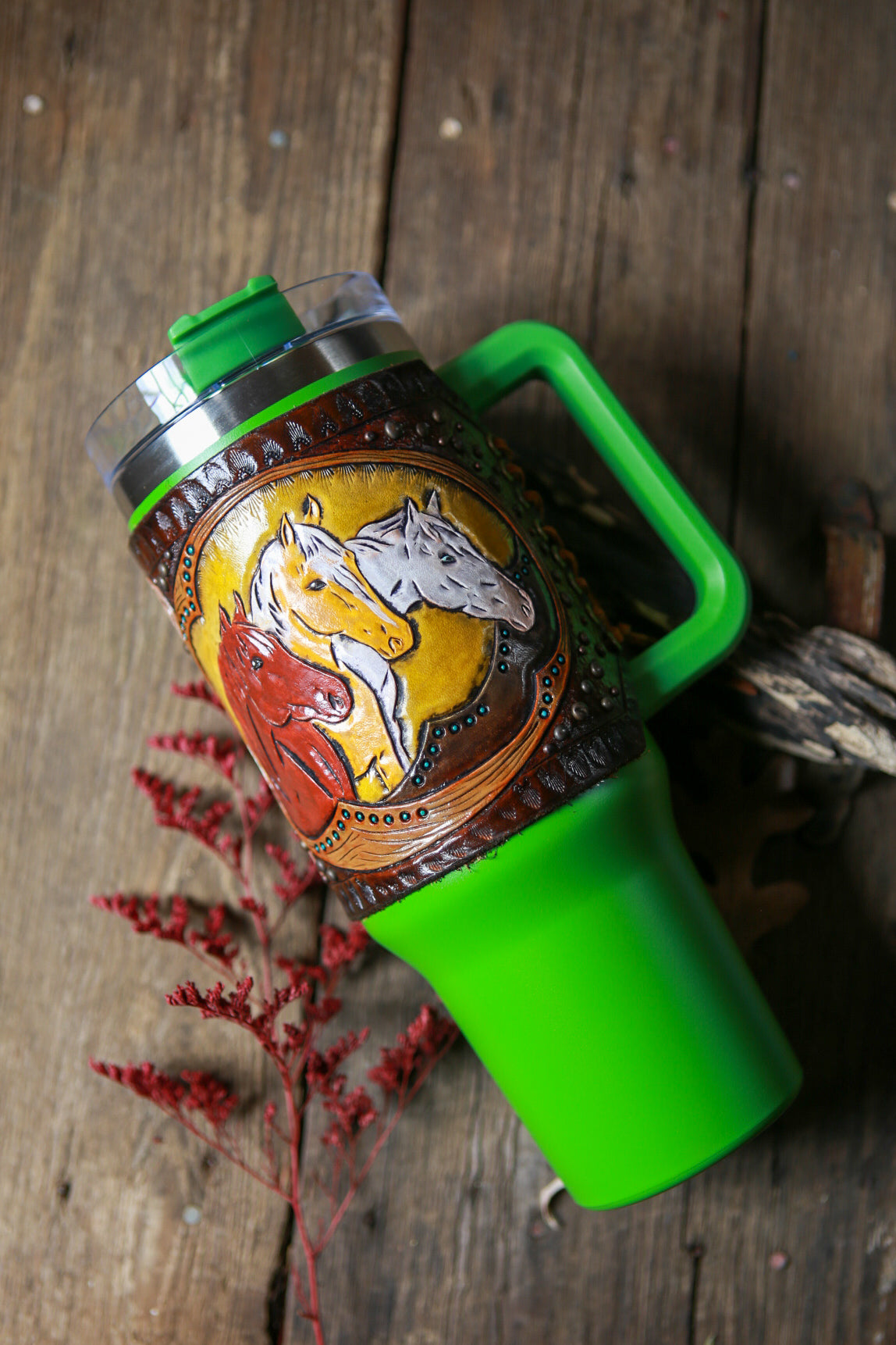 Hand tooled and painted leather tumbler wrap and 40oz green stainless steel tumbler. Also includes a plastic straw.