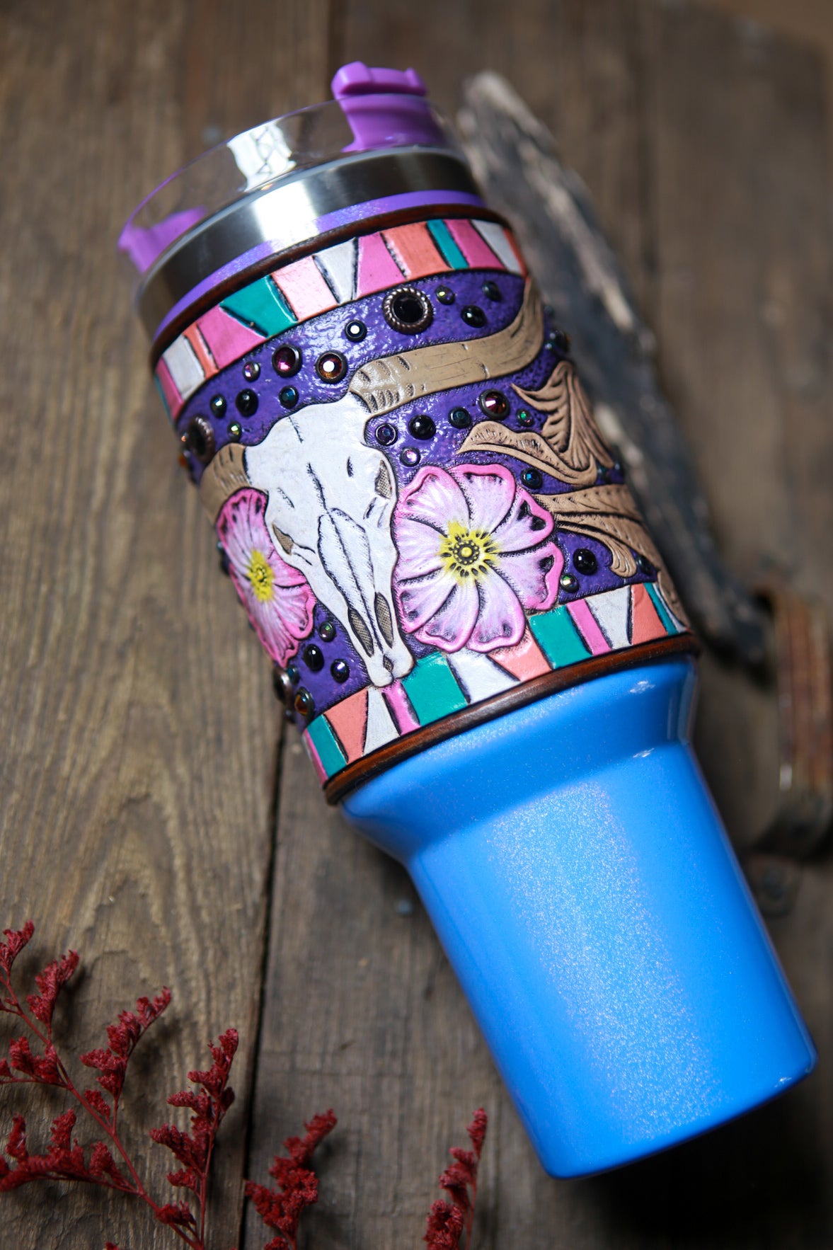 Hand tooled and painted one of a kind wrap. Includes 40oz stainless steel tumbler and plastic straw